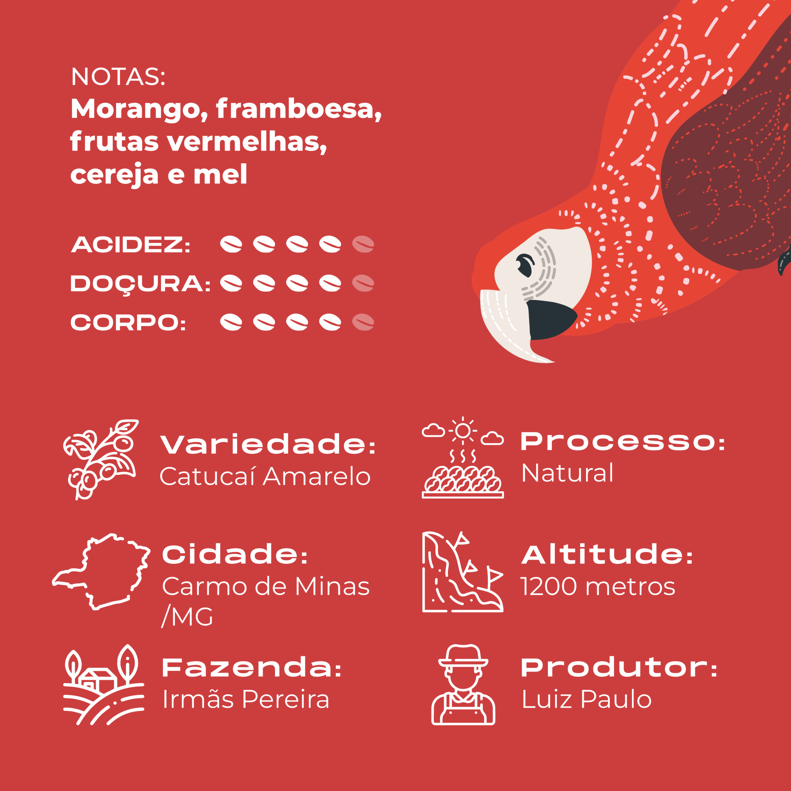Cultivado a 1.200 metros de altitude na Fazenda IP e fermentado naturalmente, o Arara Vermelha entrega uma bebida doce, aromática e envolvente.